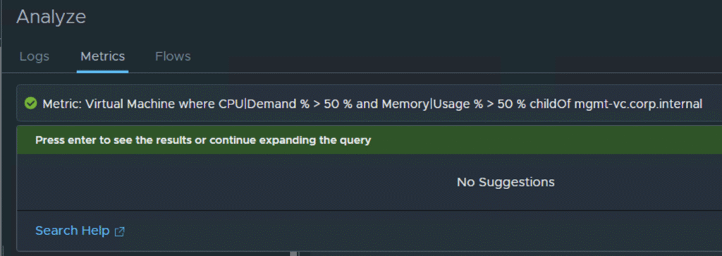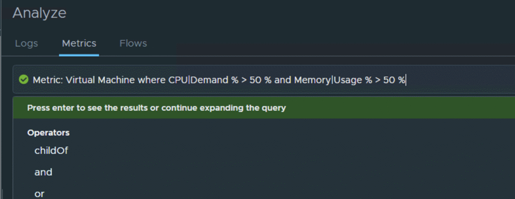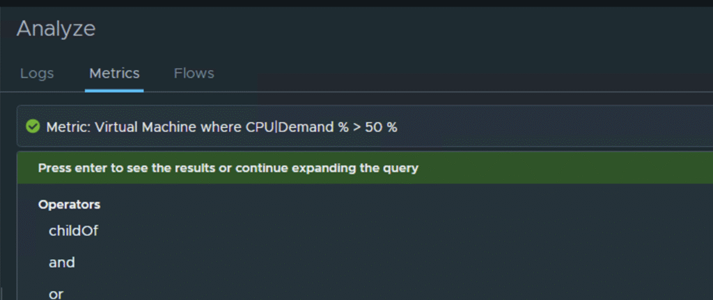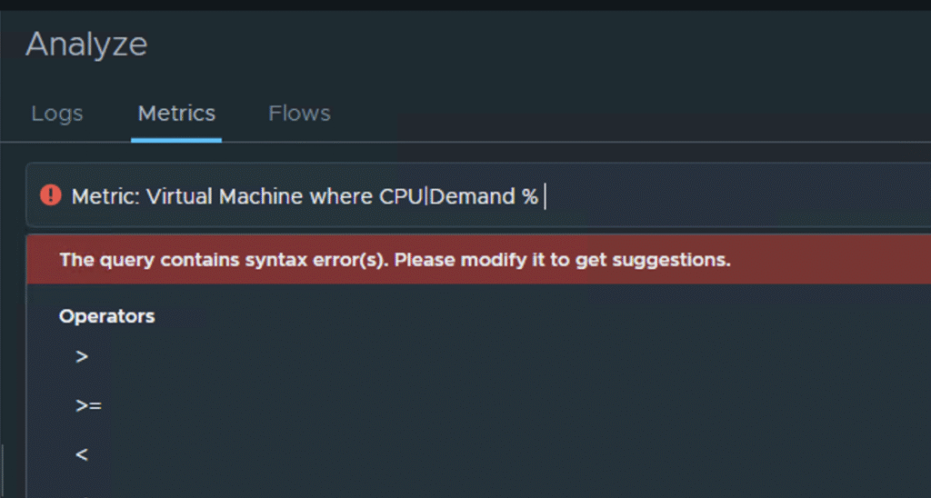 I have used a metric CPU demand for Virtual machine however note that the query is incomplete and VCF operations is also giving suggestion as to what operators you can use to complete the query. so I just added the greater than operator to complete my query. Now it looks like this.