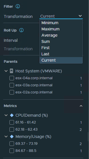 - Auto generated filter options for selecting range of metric data and corresponding count of VMs in that range
